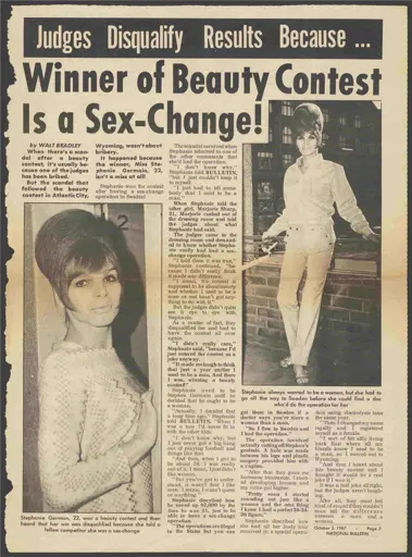 In 1967, a 22-year-old trans woman won a rural Wyoming beauty pageant. She entered the contest just a year after transitioning. Unfortunately, the judges disqualified her when she came out to a competitor. I guess trans women have an unfair advantage in beauty pageants?