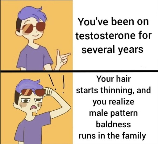 Dude lmao I lost my hair in my first year on T, it was fucking nuts. Middle Eastern genes done me dirty