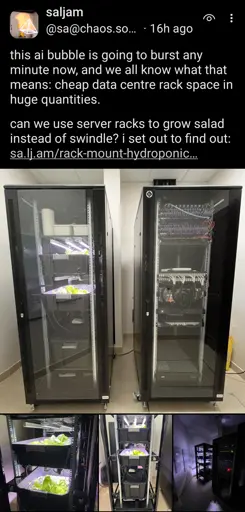 not_IO@lemmy.blahaj.zone to solarpunk memes@slrpnk.netEnglish · 25 days agousing decomissioned hardware for hydroculture is solarpunk afslrpnk.netimagemessage-square52linkfedilinkarrow-up1655arrow-down16file-text
