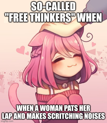 Alt text: A cute anime-style character with short pink hair and a cat-like appearance sits happily with eyes closed while a hand pats their head. The character wears a collar with a bell and looks content. Overlaid meme text reads: “SO-CALLED ‘FREE THINKERS’ WHEN” at the top and “WHEN A WOMAN PATS HER LAP AND MAKES SCRITCHING NOISES” at the bottom.