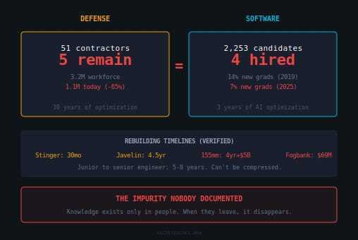 The defense industry lost the ability to make weapons when crisis hit. The same pattern is eroding software engineering skills. The timelines are identical.