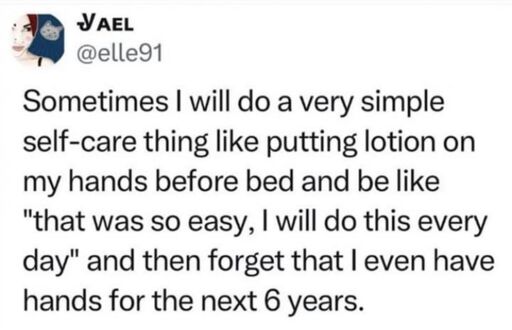 “Just do it” is what neurotypicals say when they want to give advice. “Just exercise more”, “just do yoga”, “just make a list”, “just take out the trash everyday”, “just put it away after you use it”, “just fix your sleep”, “just make an effort”, “just be normal”. It’s not advice, it’s unhelpful and talking down to a child.