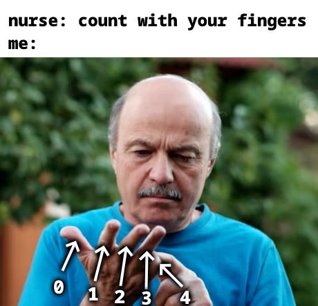 minus-squareRacoonVegetable@reddthat.comlinkfedilinkEnglisharrow-up1·2 years agoJokes on you, I use my fingers as bits for a total of 1024 numbers (0-1023). Or I can sacrifice 1 finger time be a sign bit and count negative numbers too.