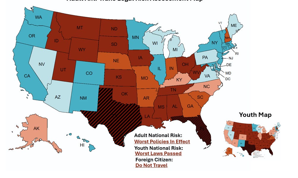 The situation has deteriorated for transgender youth around the country, with many clinics shuttering and state AGs unwilling to enforce law. For adults, some states see higher risk.