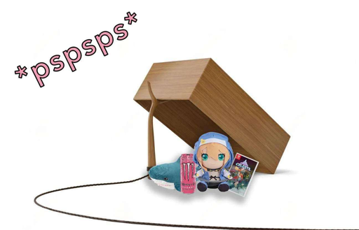 Description: A picture of a simple box trap. The bait consists of a Blahaj, a plushie of Bridget (from Guilty Gear), a Monster energy drink and a copy of the video game “Celeste”. A caption above the trap says “pspsps”.