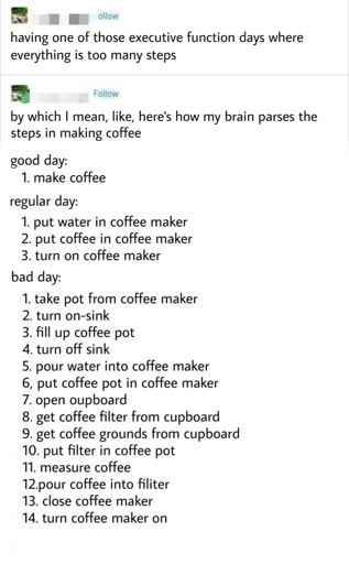 This is exactly it. And the reality is worse, because it’s not even just “get the coffee out the cupboard”, it sesrch for ten minutes for the coffee in your mess of a kitchen, eventually finding an empty packet, so you get out a new packet but have to wash the scissors to open it, then when you can’t find a a clip for the packet you decide to empty it into a old tin only to realise the tin was already full cause you did the same thing yesterday.